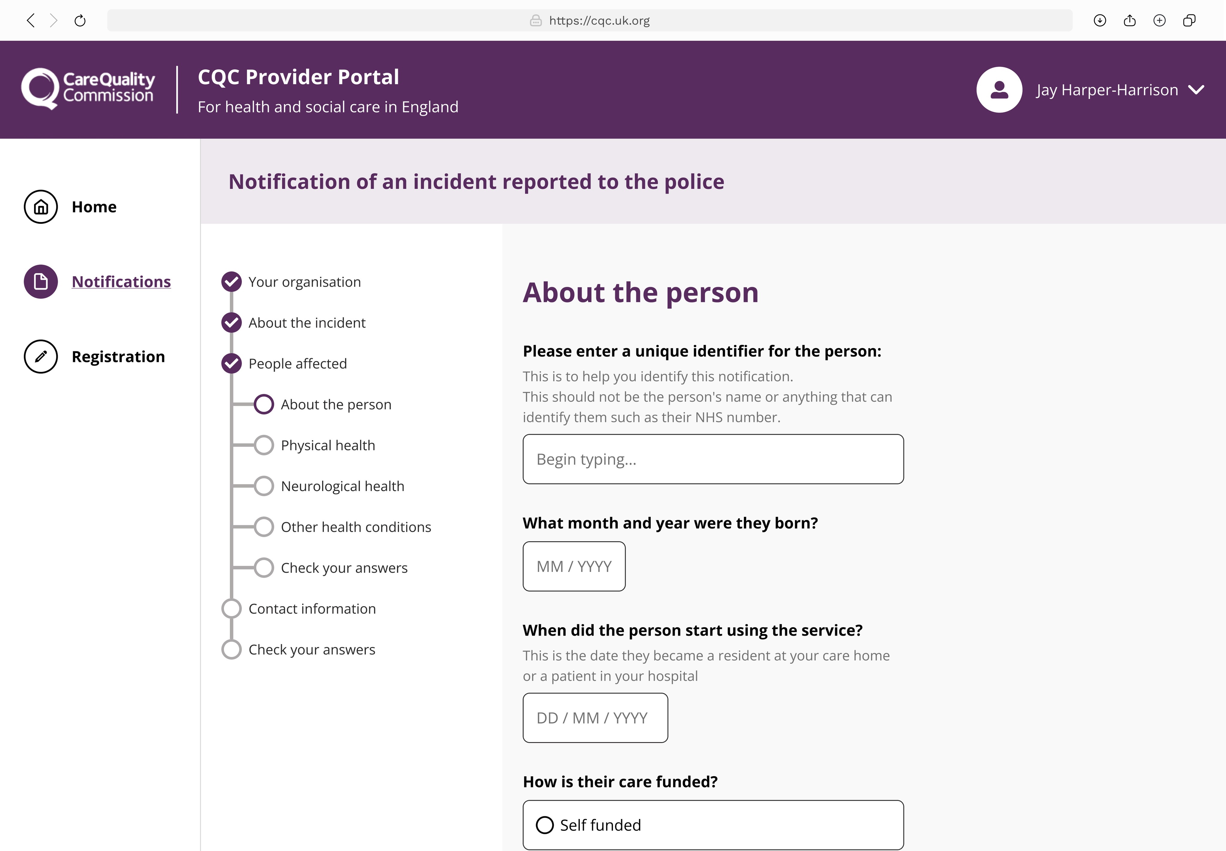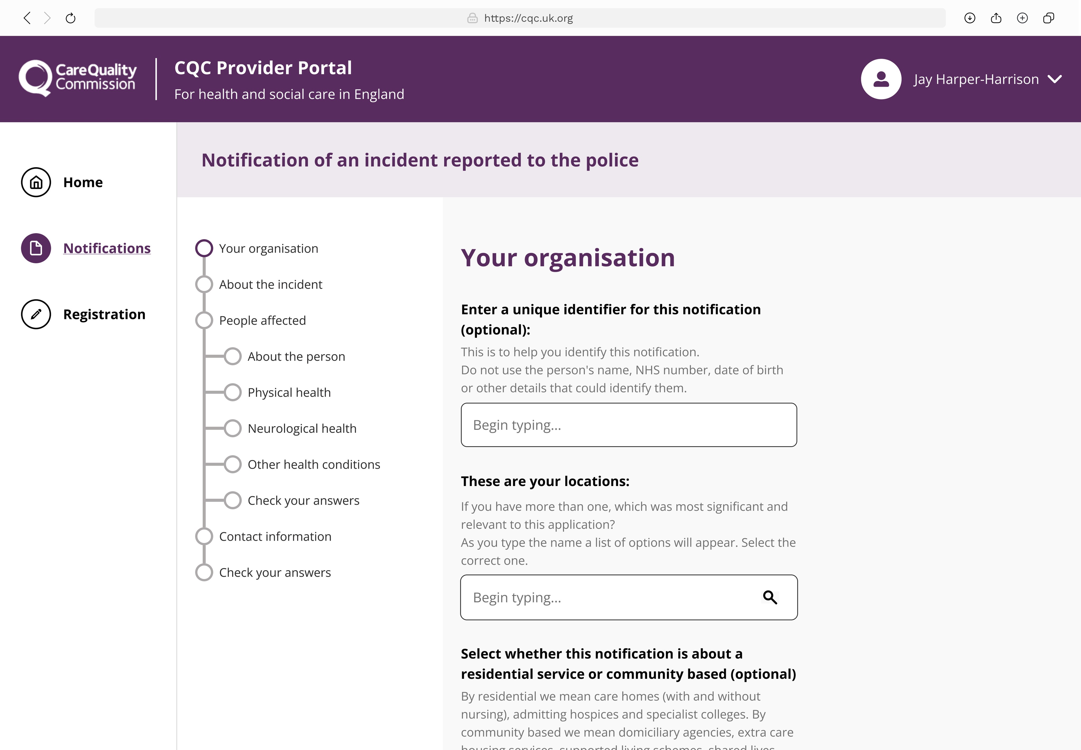 I was in charge of the stream of work known as notifications. Specifically, I was involved with the design of the police, abuse and absent registered provider notifications.